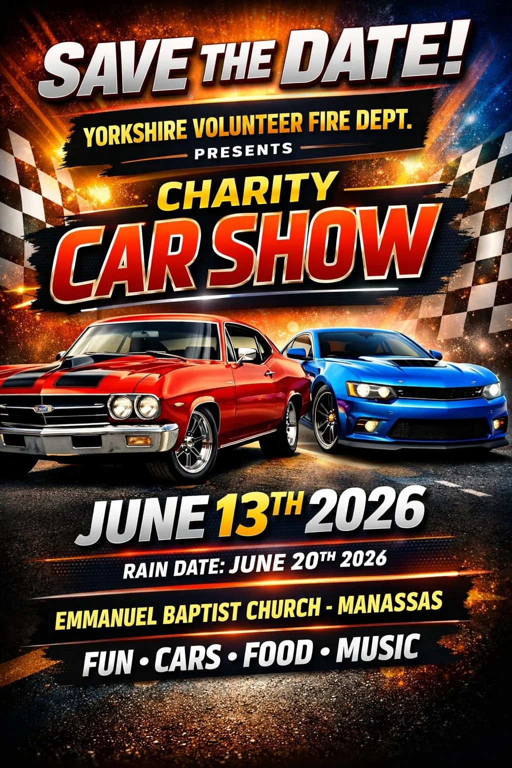 Yorkshire VFD Charity Car Show Saturday, June 13, 2026 9:00 AM 2:00 PM Emmanuel Baptist Church 8006 Centreville Road Manassas, VA, 20111 United States (map) Google Calendar ICS